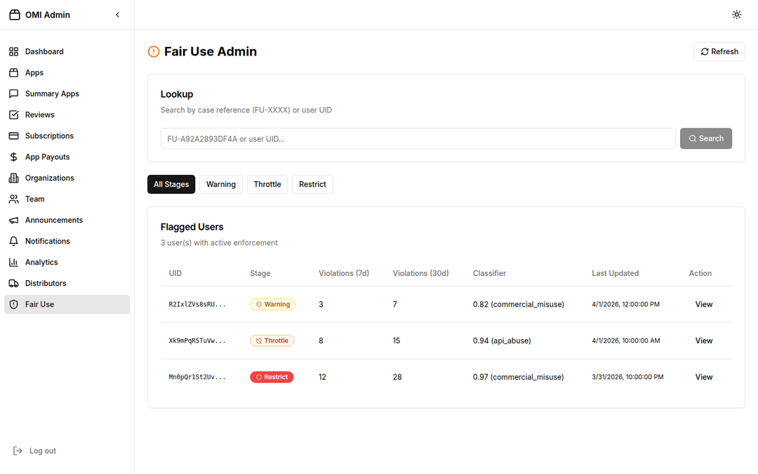 app/(protected)/dashboard/fair-use/page.tsxapp/api/omi/fair-use/flagged/route.tsapp/api/omi/fair-use/user/[uid]/route.tsapp/api/omi/fair-use/user/[uid]/reset/route.tsapp/api/omi/fair-use/user/[uid]/set-stage/route.tsapp/api/omi/fair-use/user/[uid]/resolve-event/[eventId]/route.tsapp/api/omi/fair-use/case/[caseRef]/route.tslib/redis.tscomponents/dashboard/sidebar.tsxpackage.jsonFeatures